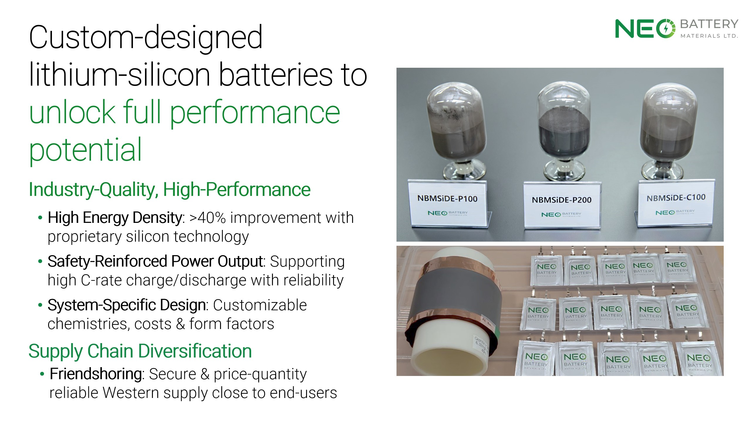 NEO Battery Materials designs customized, high-performance batteries to unlock full performance potential. From materials selection, electrode manufacturing, cell assembly to system integration, we are your one-stop shop from testing to commercial product.